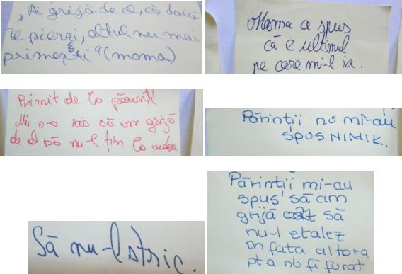 - o mica parte dintre copii a primit de la adulti si informatii care se refera la regulile elementare de siguranta si de protejare a bunurilor personale. De cele mai multe ori sfatul primit a fost SA AI GRIJA DE EL sau SA NU IL STRICI.