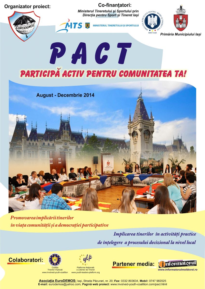 Asociatia EuroDEMOS desfasoara in perioada august – decembrie 2014 proiectul PACT – Participa Activ pentru Comunitatea Ta!. Proiectul este cofinatat de Ministerul Tineretului si Sportului prin Directia Judeteana pentru Sport si Tineret Iasi si de Primaria Municipiului Iasi.