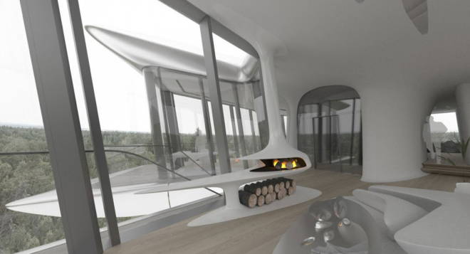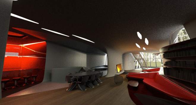 La primul etaj se afla camerele copiilor, cele pentru musafiri si o biblioteca. Al doilea etaj este rezervat activitatilor recreative. Pana si semineele au un design futuristic.