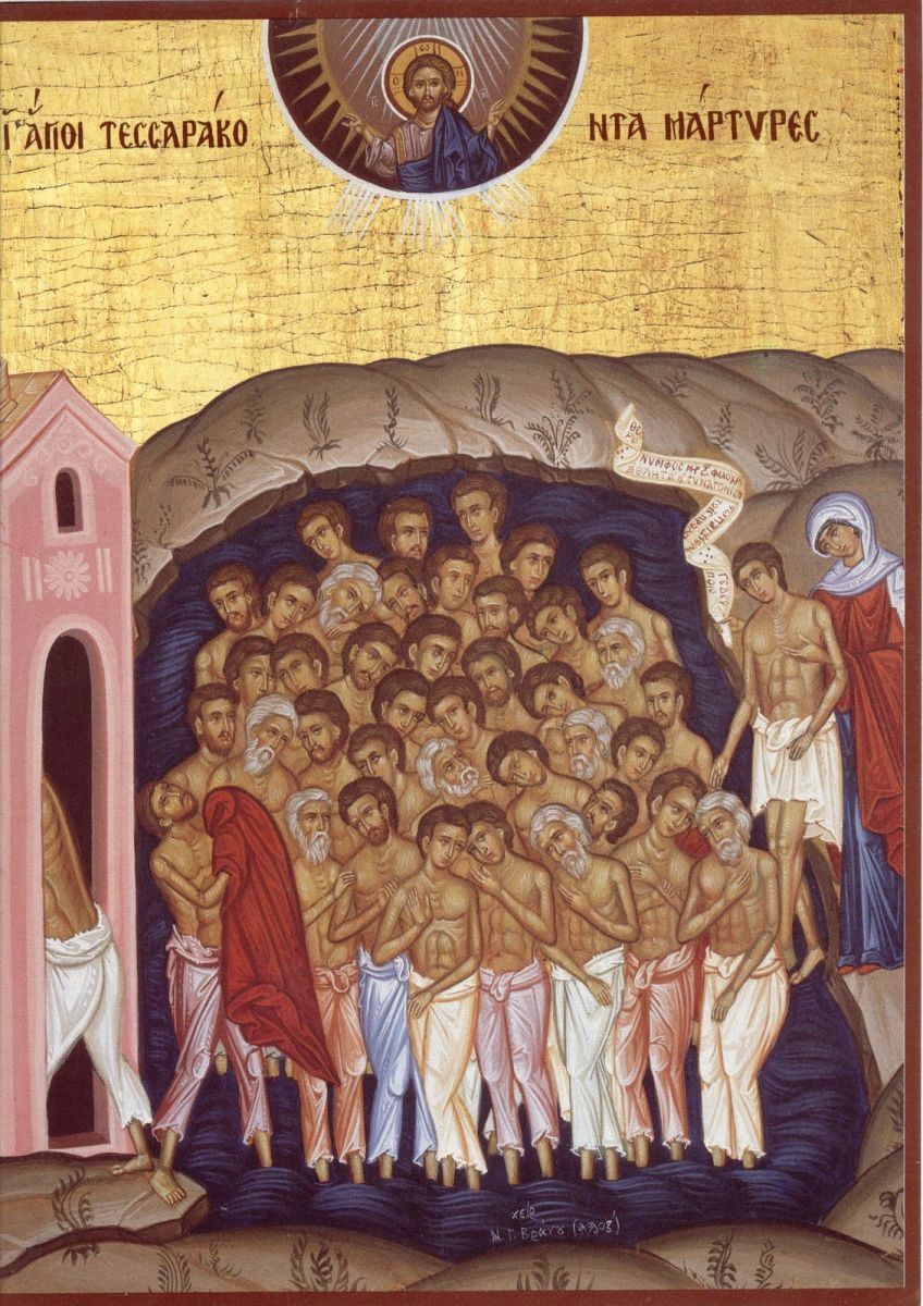 Cei 40 de mucenici din Sevastia praznuiti astazi erau soldati in armata imparatului roman Licinius. Atunci cand guvernatorul Armeniei a descoperit ca sunt credinciosi si se pricep sa studieze Biblia i-au pus sa se inchine idolilor. Mucenicii au refuzat acest lucru si au fost tinuti in temnita mai bine de o saptamana. Guvernatorul a incercat orice truc pentru a-i intoarce de la credinta, inclusiv sa-i ademeneasca cu daruri, dar totul in zadar. Dupa toate eforturile mucenicii au fost condamnati la moarte prin inghetare in Lacul Sevastiei. Noaptea s-au petrecut o serie de minuni: apa lacului s-a incalzit, gheata s-a topit si 40 de cununi stralucitoare au pogorat asupra mucenicilor. A doua zi dupa ce au fost scosi din lac, li s-a zdrobit picioarele si au fost lasati sa-si dea sufletele in chinuri. Pentru a ne aminti de jertfa mucenicilor adusa lui Dumnezeu, astazi gospodinele pregatesc sfinti, colaci mici, unsi cu miere si presarati cu nuca pe care ii sfintesc la Biserica si ii ofera de pomana. Barbatii trebuie sa bea, conform traditiei, 40 de pahare cu vin. Se spune ca acestea reprezinta sangele varsat de cei 40 de sfinti mucenici din cetatea Sevastei si se transforma de-a lungul anului in sange si putere de munca.