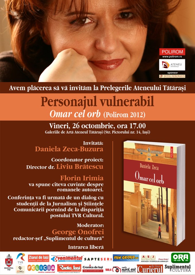 Articol de Madalina IrimiaVineri, 26 octombrie, la ora 17.00, la Galeriile de Arta - Ateneul Tatarasi din Iasi (str. Pictorului, nr. 14), Daniela Zeca-Buzura va sustine o conferinta cu titlul „Personajul vulnerabil”, pornind de la romanul Omar cel orb, publicat de curind in colectia „Ego. Proza” (coordonator Lucian Dan Teodorovici) a Editurii Polirom, inclusiv in editie digitala. Evenimentul are loc in cadrul proiectului „Prelegerile Ateneului Tatarasi”.