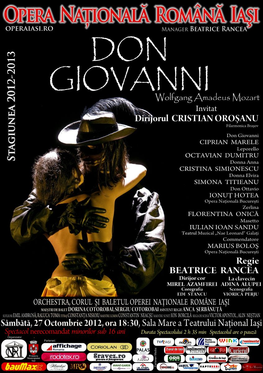 Piesa care a lansat mitul lui Don Juan (Don Giovanni) este Seducatorul din Sevilla si oaspetele de piatra, al lui Tirso de Molina, publicata in 1630 la Barcelona. Personajul Don Juan l-a atras pe Mozart, care a transpus mitul intr-o opera memorabila, pe un libret scris in limba italiana de Lorenzo da Ponte. Spectacolul oferit de Opera ieseana este, de asemenea, in limba italiana. Premiera absoluta cu Don Giovanni a avut loc in anul 1787, la National Theater din Praga, sub bagheta marelui Mozart. La Viena, opera a fost jucata in 1788. Caracterul romantic al acestei opere se desprinde si din mesajul pe care il transmite compozitorul: din cinicul si decadentul Don Giovanni, Wolfgang Amadeus Mozart face un erou autentic, modern, capabil sa-si dea viata pentru principiile sale.