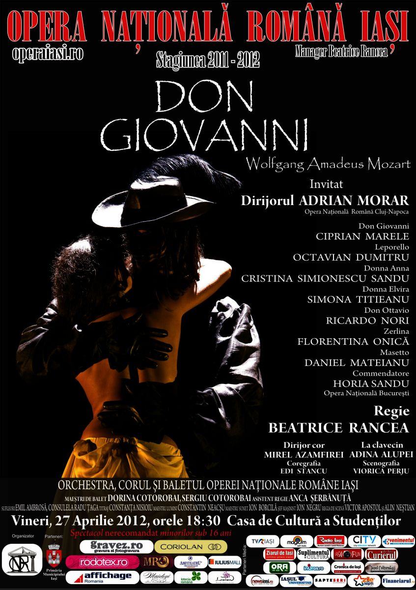 Piesa care a lansat mitul lui Don Juan (Don Giovanni) este „Seducatorul din Sevilla si oaspetele de piatra”, al lui Tirso de Molina, publicata in 1630 la Barcelona. Personajul Don Juan l-a atras pe Mozart, care a transpus mitul intr-o opera memorabila, pe un libret scris in limba italiana de Lorenzo da Ponte. Spectacolul oferit de Opera ieseana este, de asemenea, in limba italiana, cu subtitrare in limba romana.