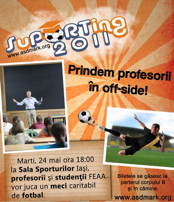 Profesorii Facultatii de Economie si Administrarea Afacerilor, isi vor confrunta in aceasta seara studentii in cadrul unui meci de fotbal organizat in scop caritabil de Asociatia Studentilor din Domeniul Marketing (AsdMARK). Bilete si informatii suplimentare puteti gasi la parterul corpului B al Universitatii “A. I. Cuza”.