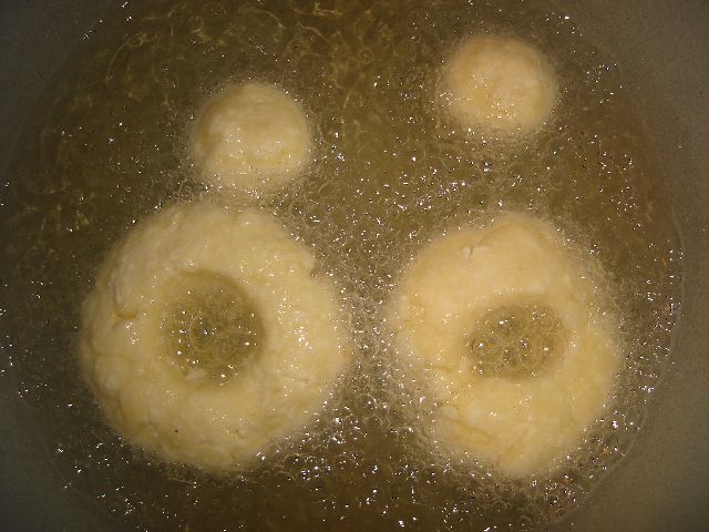 Intr-un castron se amesteca branza de vaci, faina, ouale, putina sare, un varf de cutit de bicarbonat stins cu lamaie si pliculetul de zahar vanilat. Se amesteca bine cu mixerul pentru a nu se forma cocoloase, pana cand compozitia nu mai este lipicioasa.